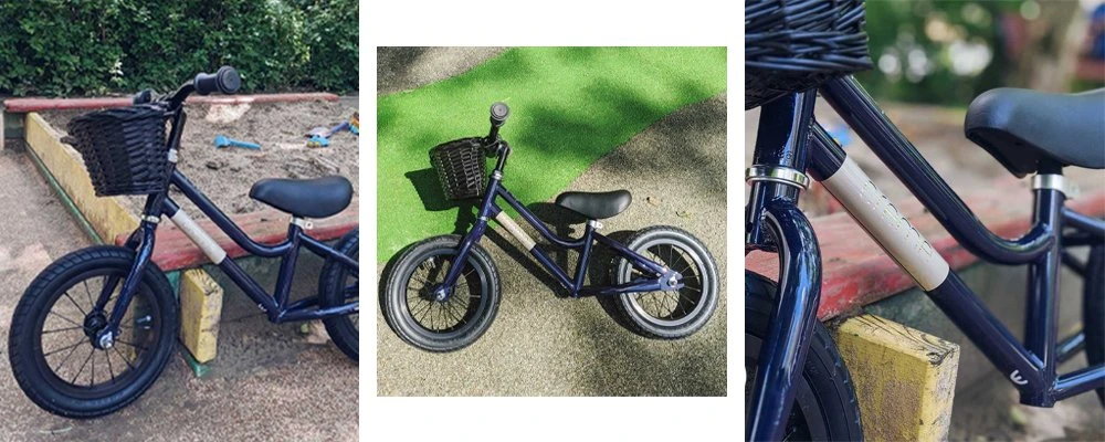 В комплекте с велосипедом идет небольшая плетеная корзинка: все по-взрослому! Нам нравится, что у беговела силиконовые, а не кожаные грипсы: они не скользят и убиваются гораздо медленнее кожаных: ведь все дети роняют и кидают беговелы.
