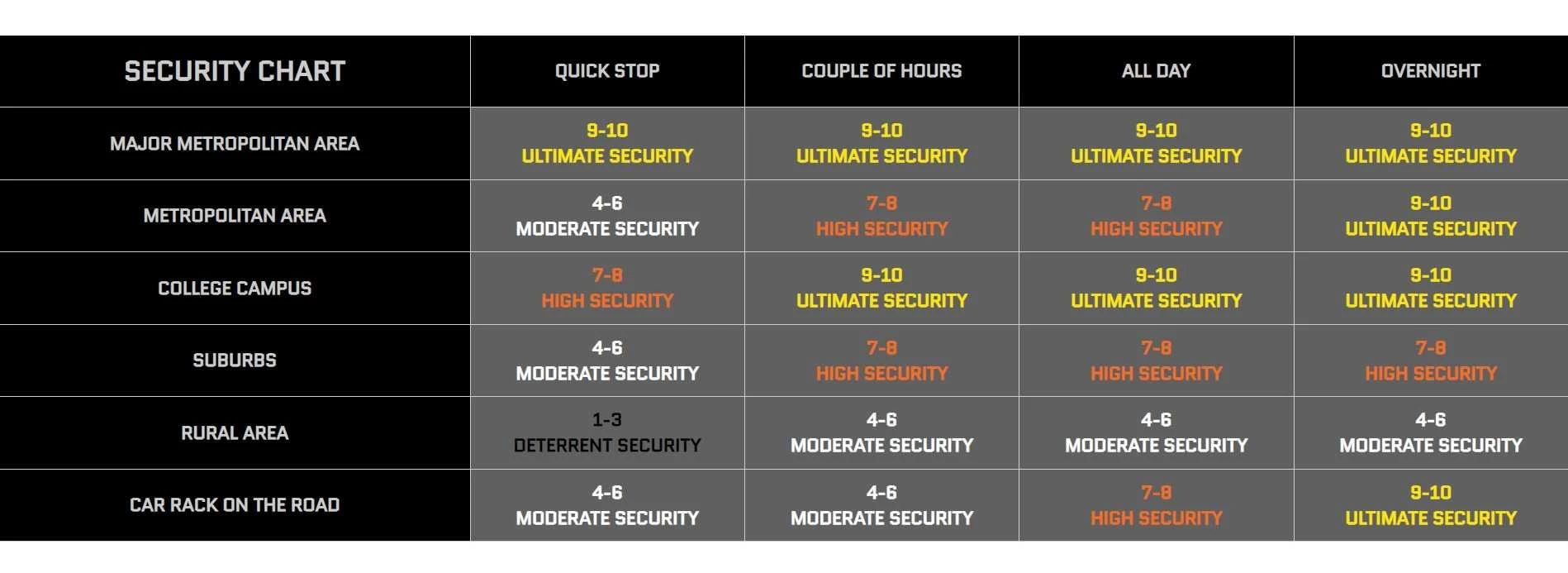 В целом ничего нового Kryptonite не рекомендует: чем опасней место — тем выше класс безопасности замка стоит использовать.