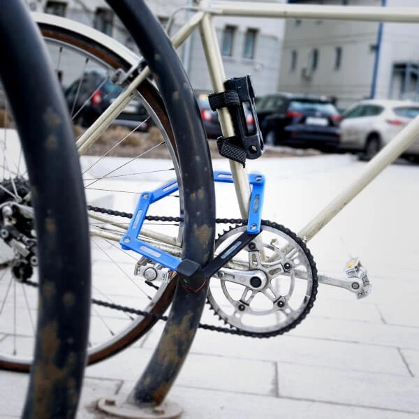 Второй интересный замок отчасти похож на v-brake тормоза, которые ну прям совсем тормозят. Намертво блокирует колесо и всегда под рукой: нет необходимости его снимать, только “включить” и “выключать”.