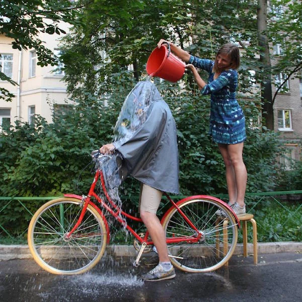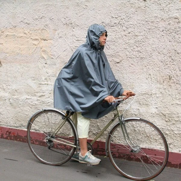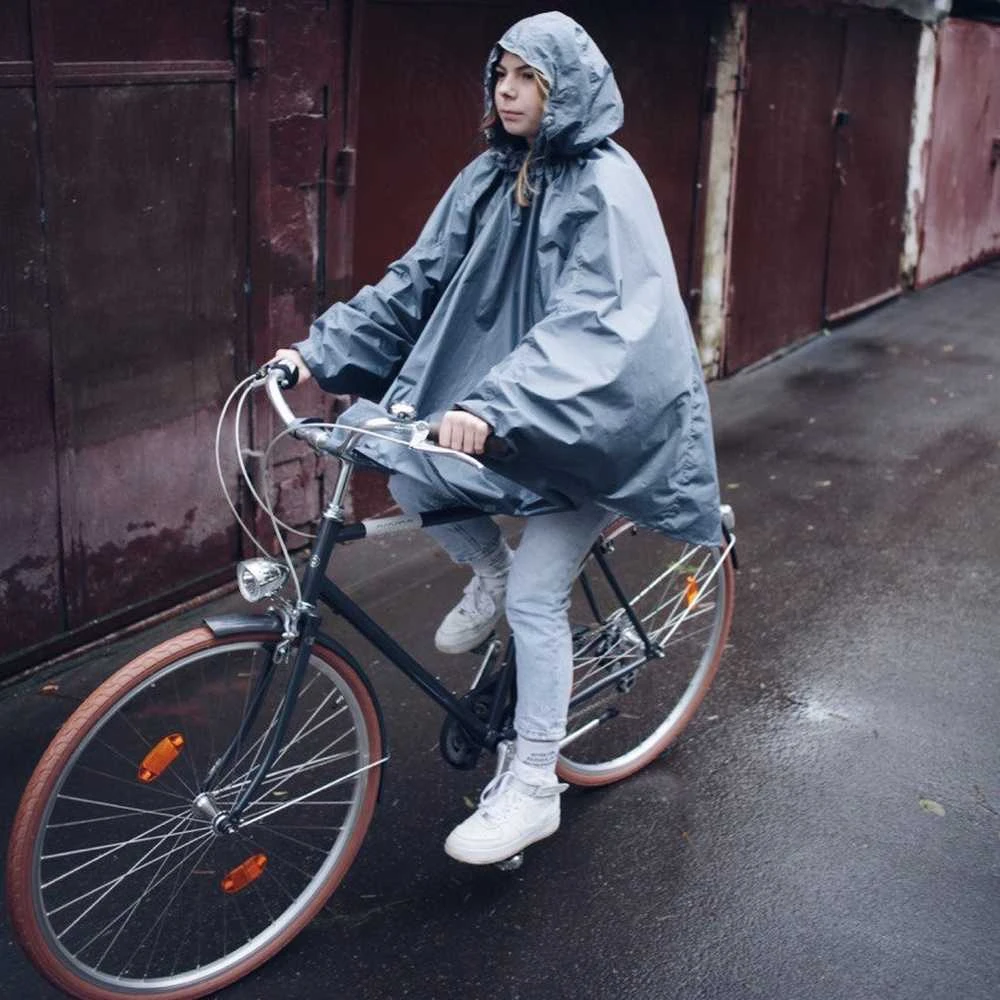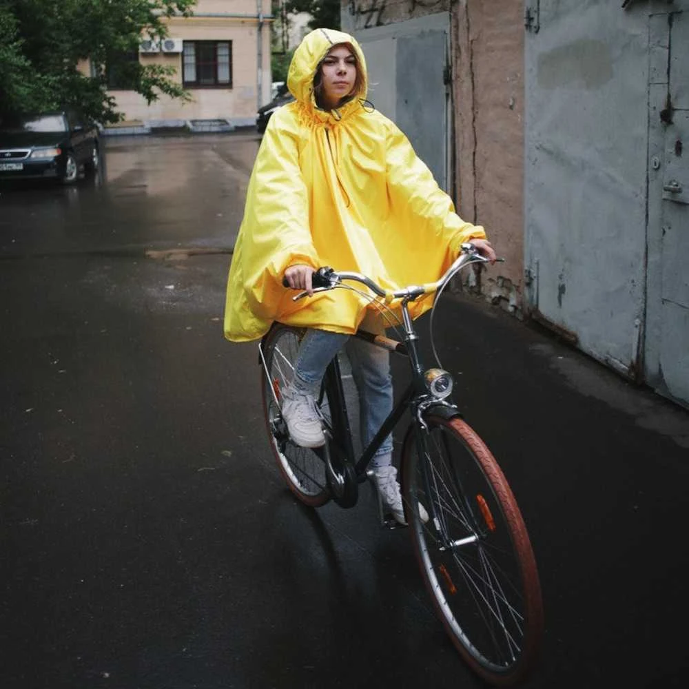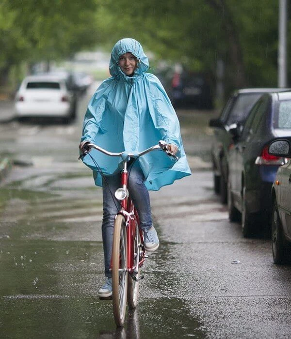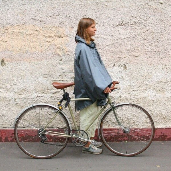 - Плащ крепится к раме или седлу велосипеда. Он всегда с вами на случай дождя, ливня и другой стихии. Поможет и от снега, и от проблем с полицией;