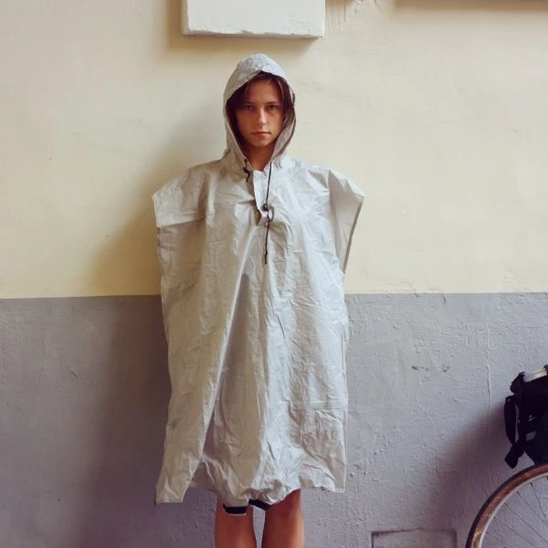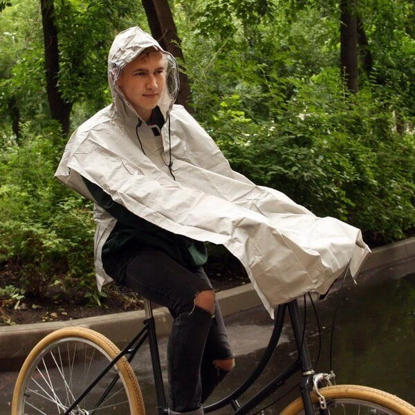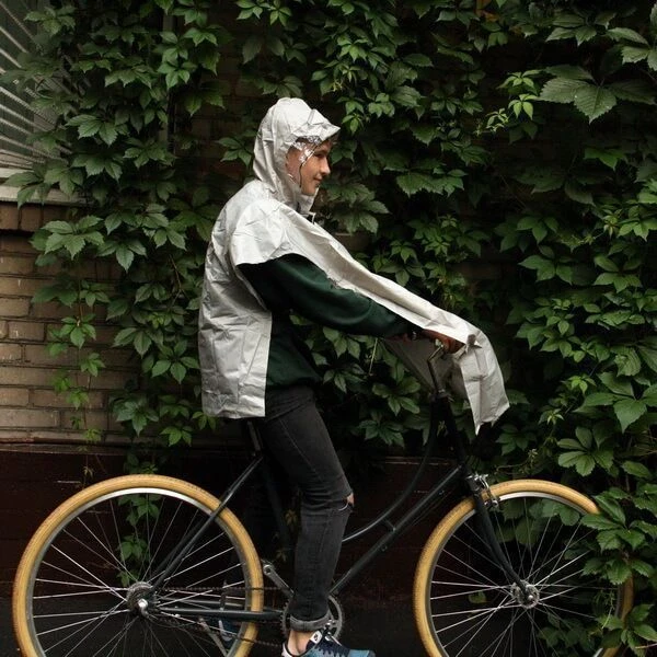 Велосипедный дождевик Kabrio, который убирается в сумочку, которая вешается на раму или руль велосипеда.