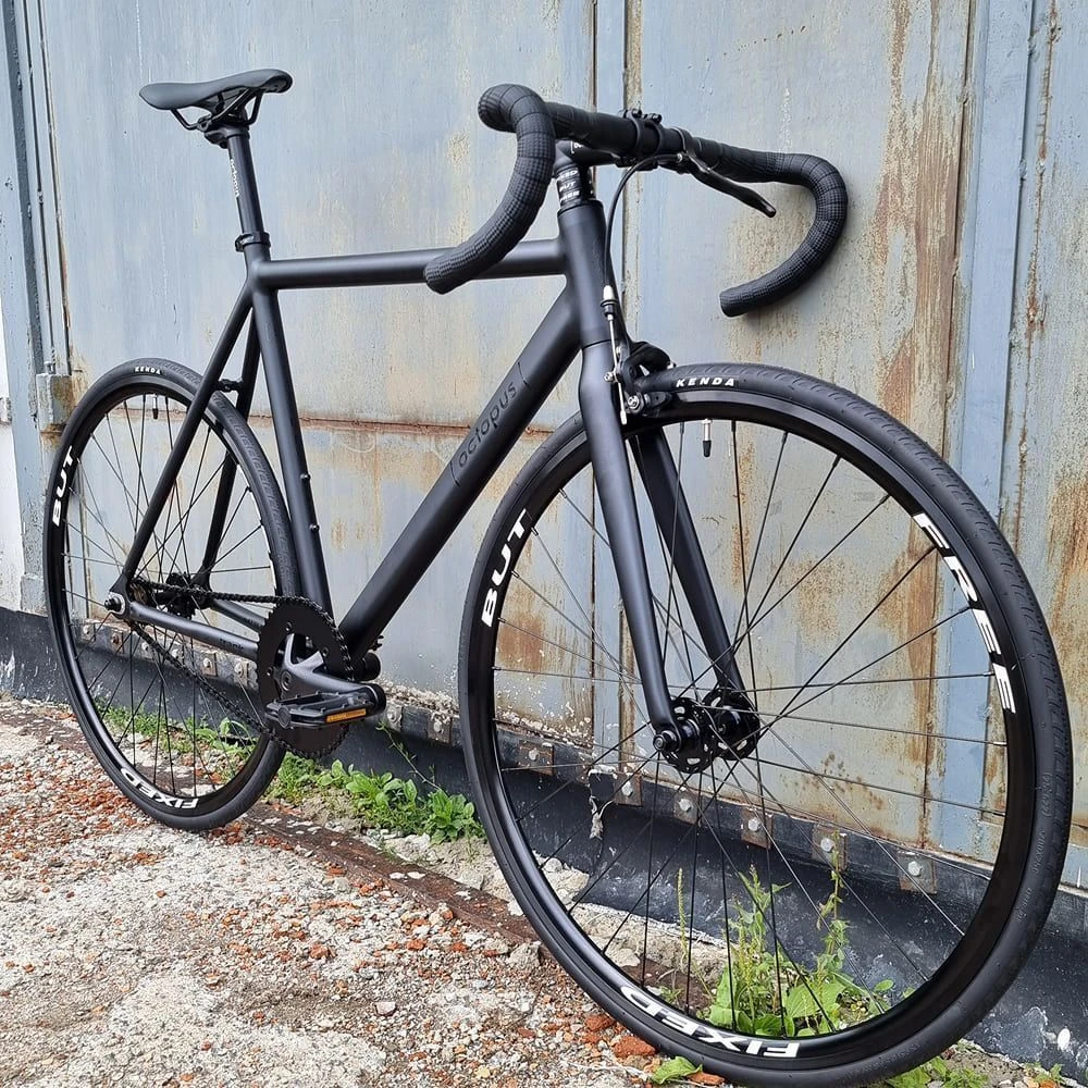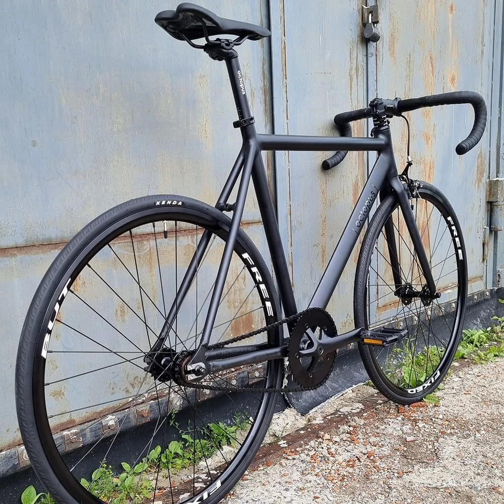 Полностью алюминиевый 6061 фреймсет с двойным баттингом, двухсторонние стальные накладки на дропаутах, приличные зазоры под покрышки 35мм сзади и 32мм спереди. Фривил, тормоз и фикс звезда в комплекте.