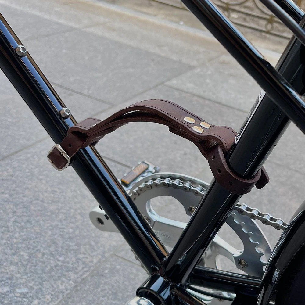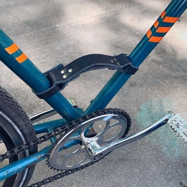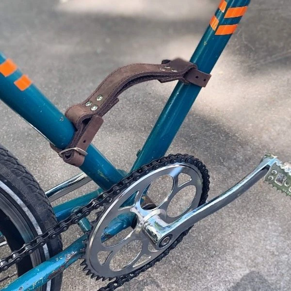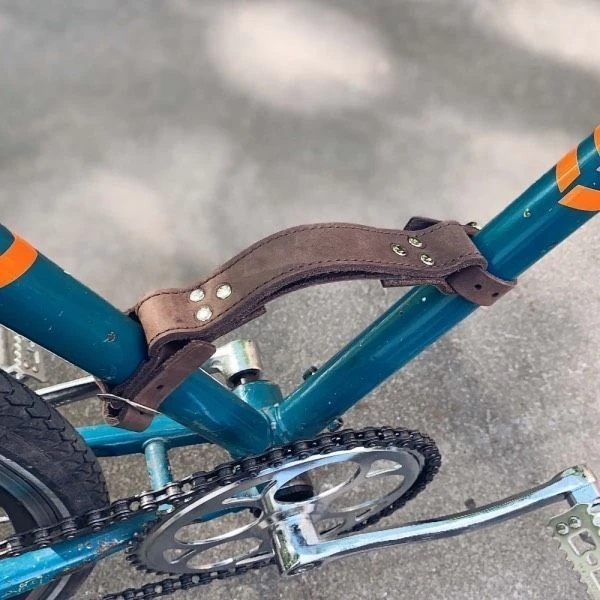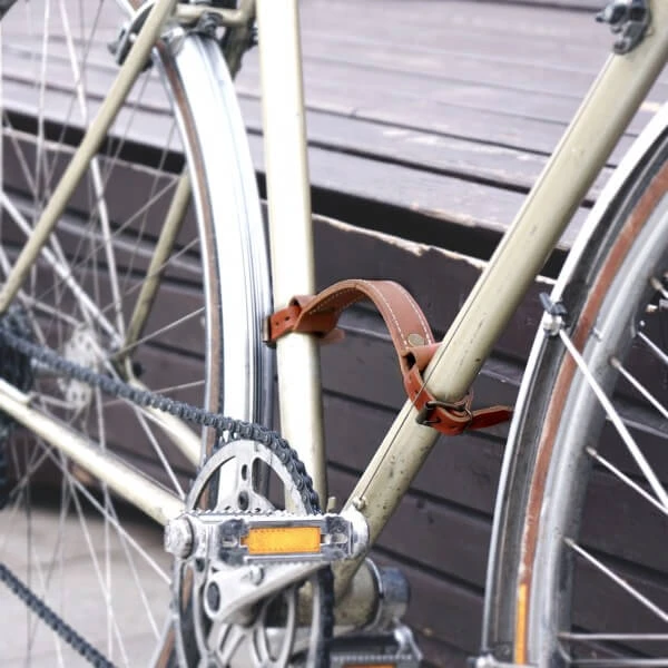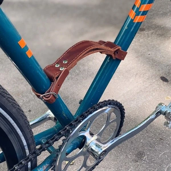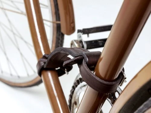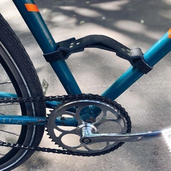- Устройство ее очень простое: два ремешка, которые имеют язычок и отверстия (по принципу работы ремня), крепятся к V-образной части рамы; между двумя ремешками есть перешеек, за который можно поднять велосипед и нести куда захочется.