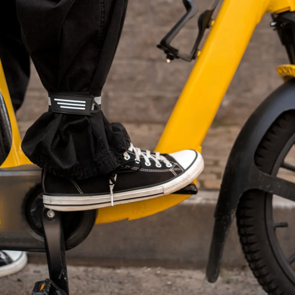 - При это зажим плотно прижимает штанину к ноге и не дает ей развиваться на ветру.