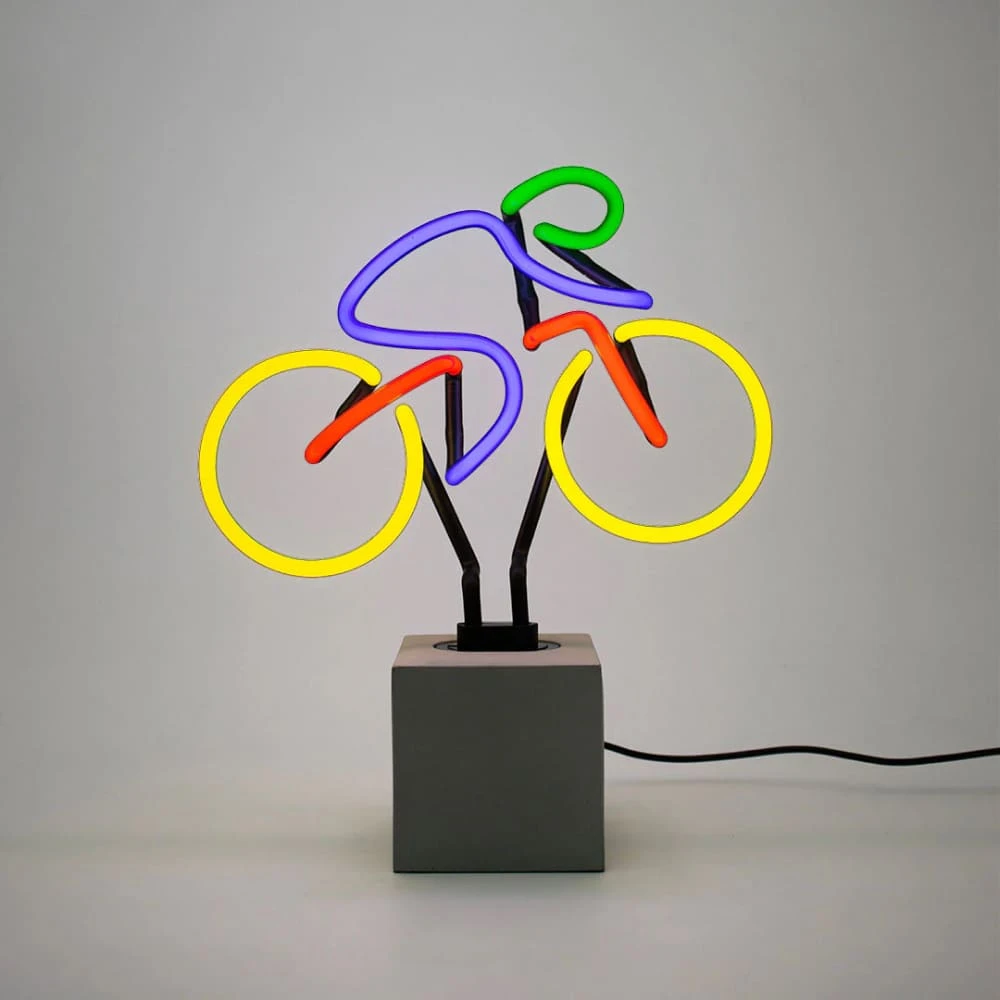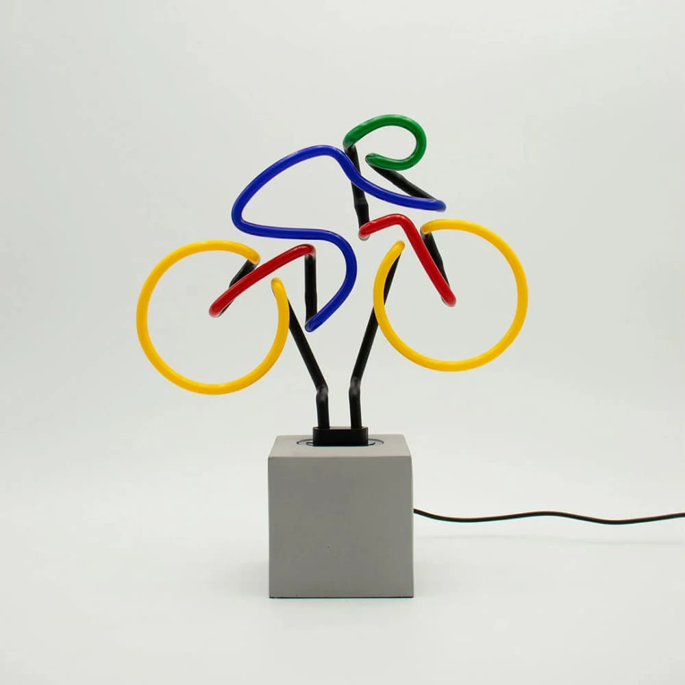 Эта настольная неоновая лампа ручной работы из настоящего стеклянного неона установлена на бетонном основании. Ретро красота с велосипедным контекстом.