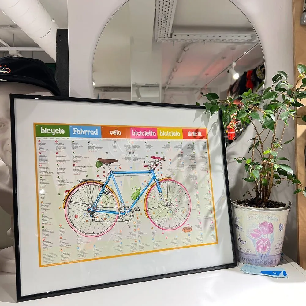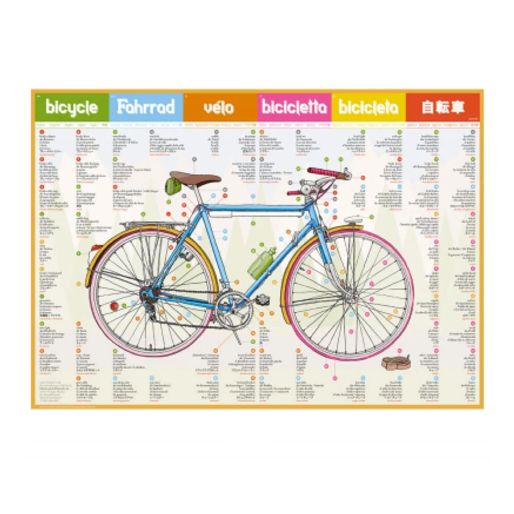 Постер с изображением велосипеда размером A3 напечатан с использованием полностью экологически чистых материалов и содержит 65 терминов, связанных с велосипедом, на шести языках.