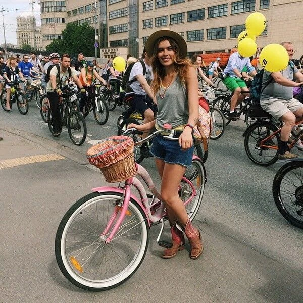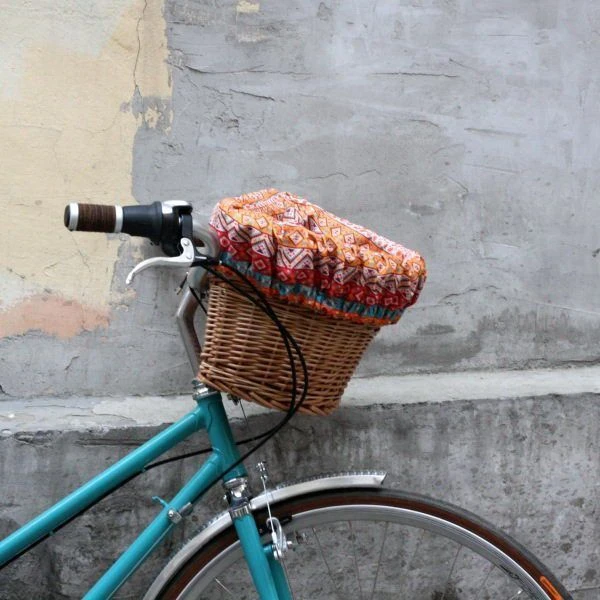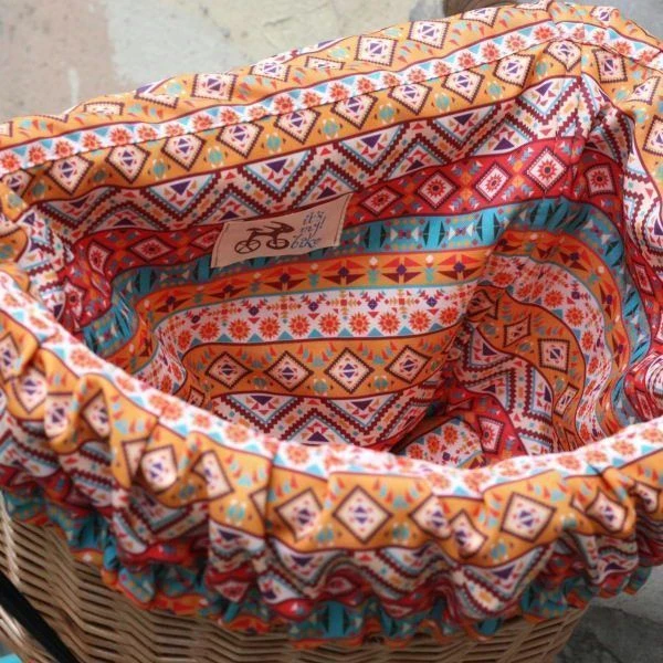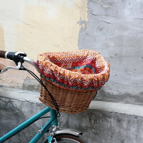 Удобная корзина на руль с ярким вкладышем из ткани.
