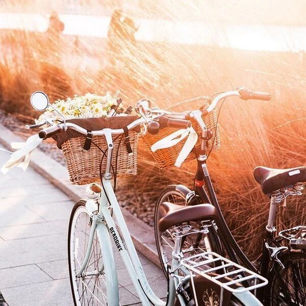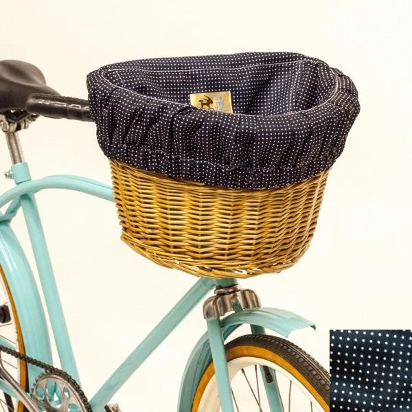 Удобная корзина на руль с ярким вкладышем из ткани.