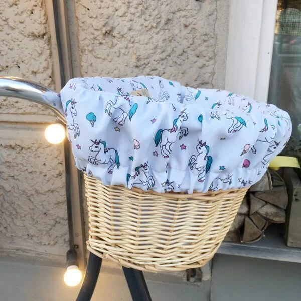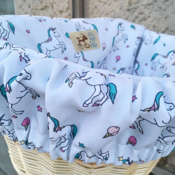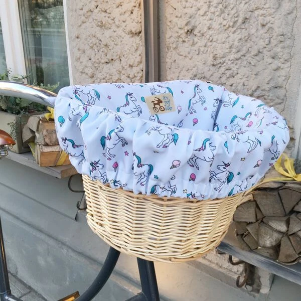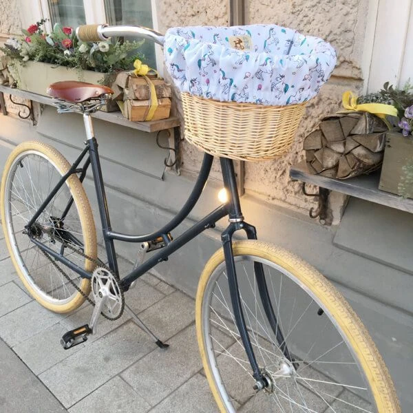 Удобная корзина на руль с ярким вкладышем из ткани.