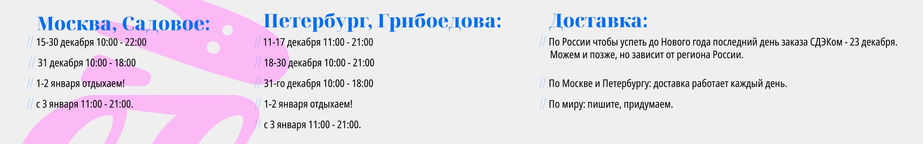 С нами удобно: шоурум в центре Москвы, самовывоз из Питера, доставка курьером в день заказа, почтой России и CDEK. Работаем без выходных. Бесплатно доставим заказы от 10000. Принимаем карты.