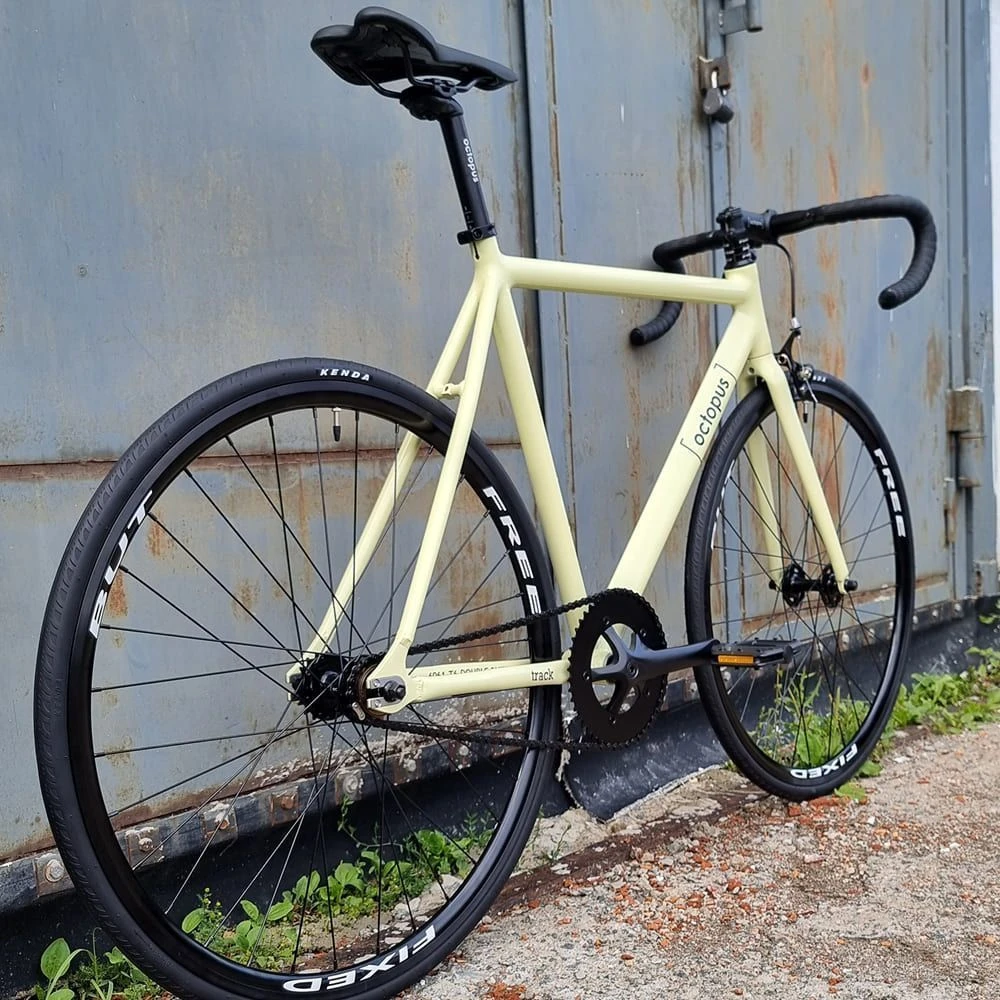 Полностью алюминиевый 6061 фреймсет с двойным баттингом, двухсторонние стальные накладки на дропаутах, приличные зазоры под покрышки 35мм сзади и 32мм спереди. Фривил, тормоз и фикс звезда в комплекте.
