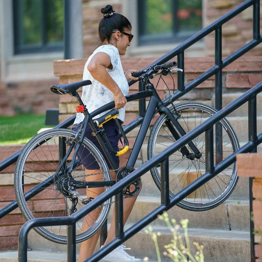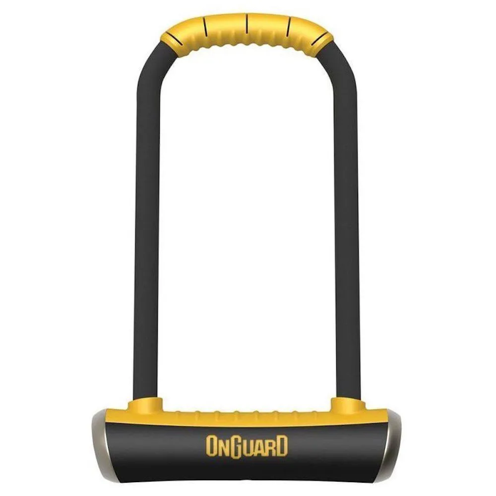 Велосипедный замок OnGuard Pitbull с двойным запорным механизмом дуги, который обеспечивает максимальную защиту при попытке перепилить замок.