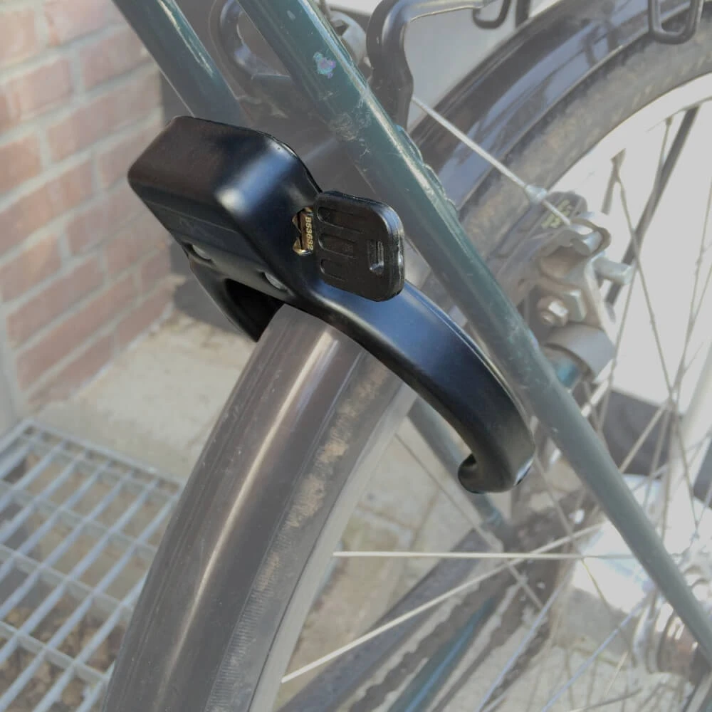 - Путь окончен? Тогда поверните ключ одной рукой, другой оттяните пластиковый зажим, и железный обод крепко обнимет заднее колесо. Вынимайте ключ - заднее колесо заблокировано.