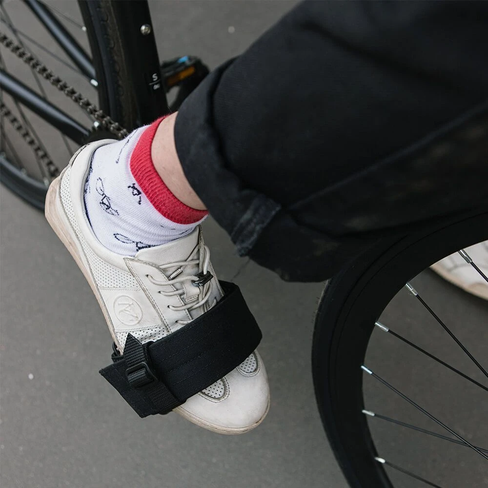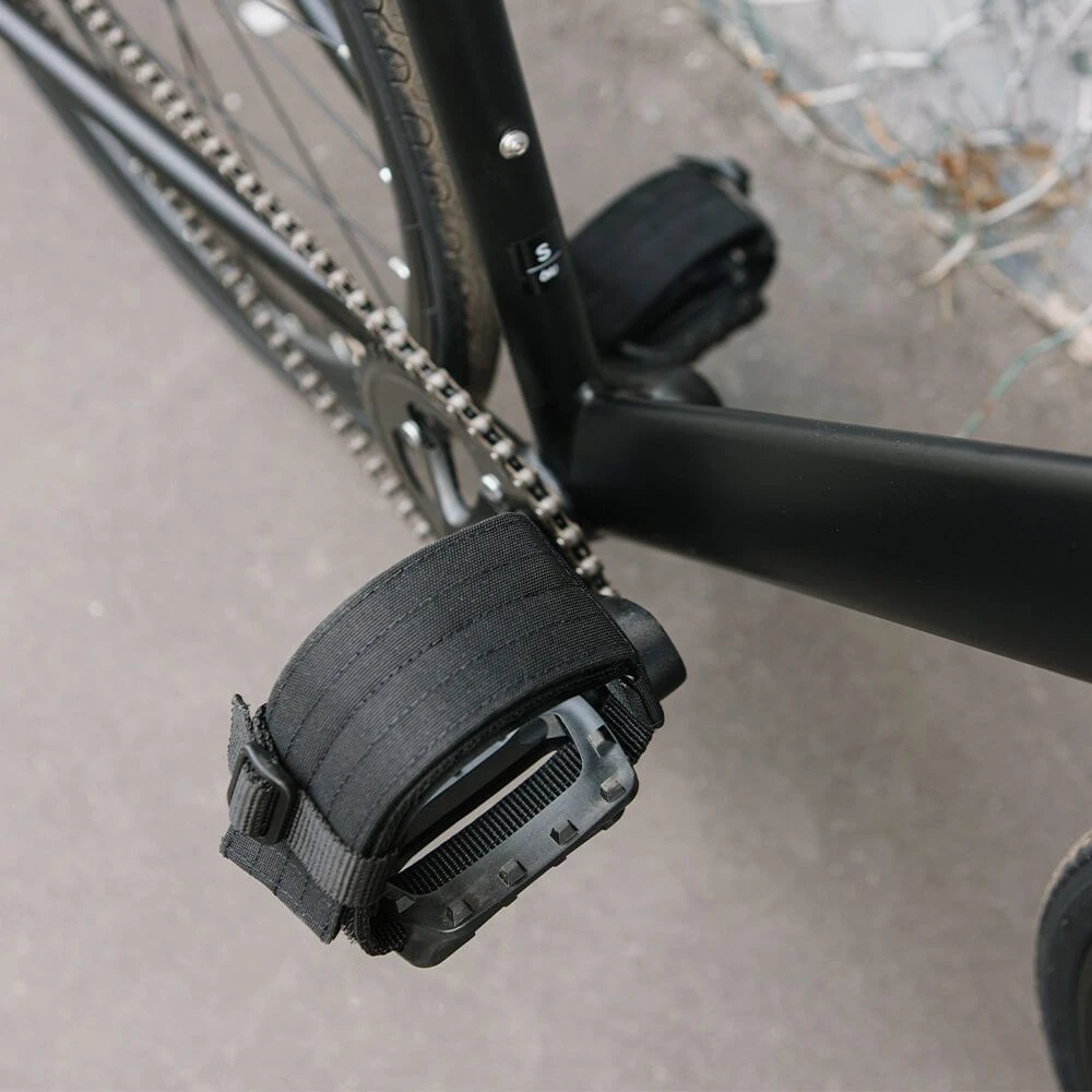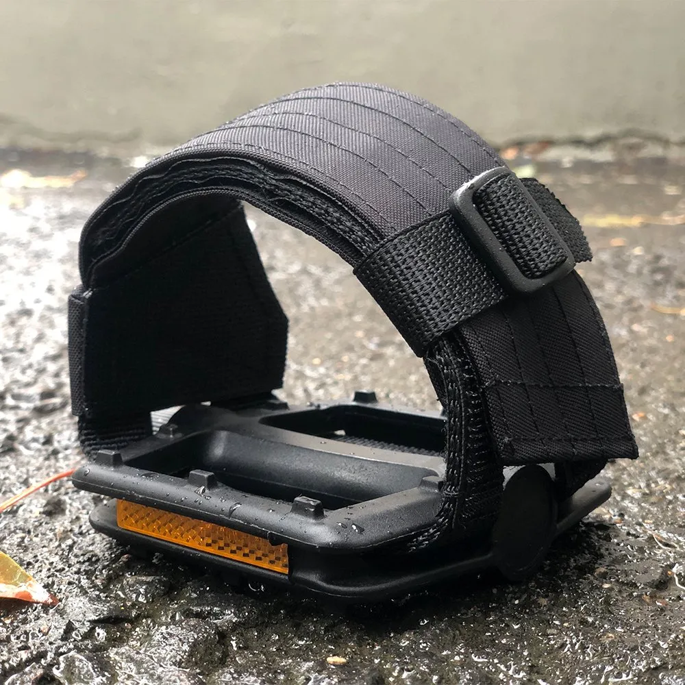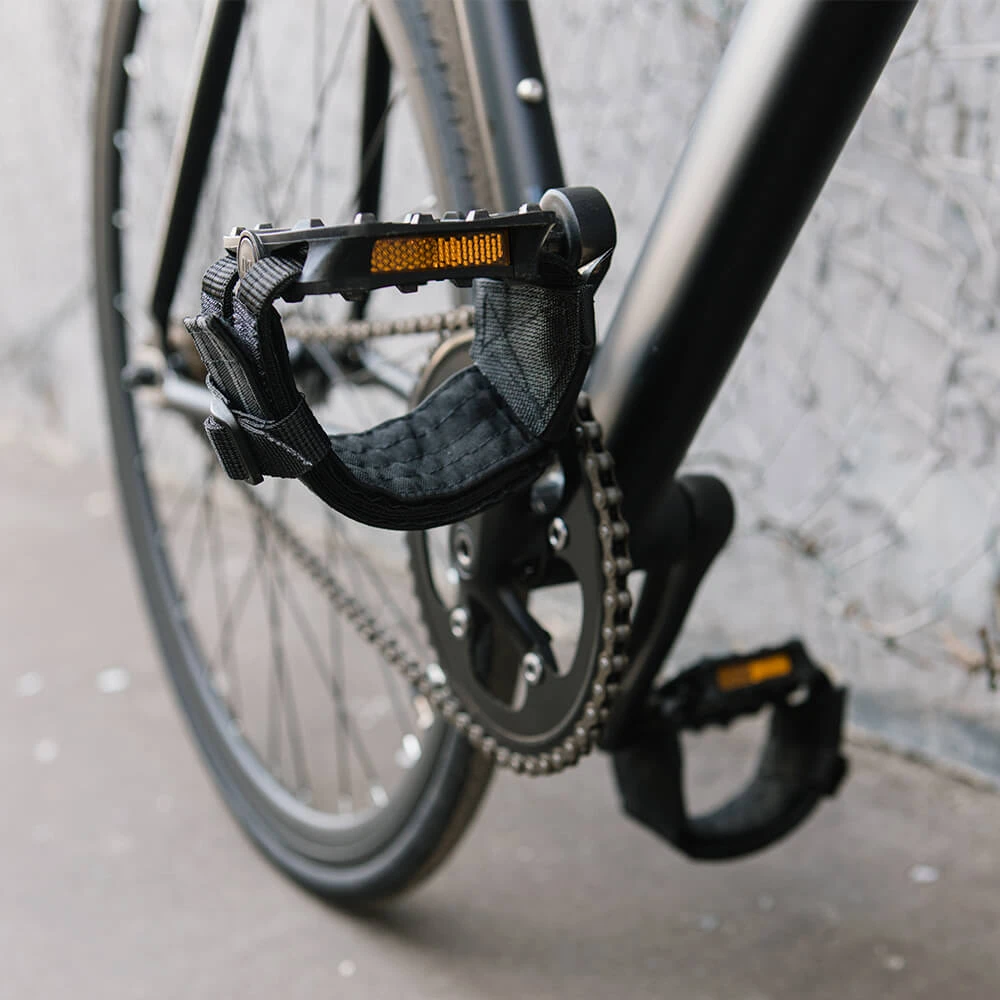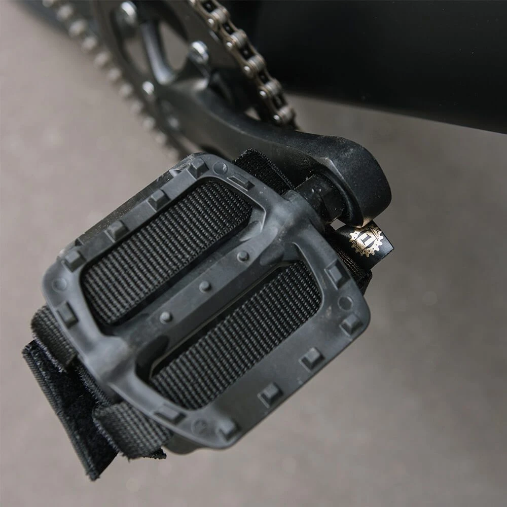 Педальные стрепы на липучке для MTB/BMX педалей-платформ из материалов повышенной прочности с дополнительными страховочными ремнями, предотвращающими расстегивание. Предназначены для контакта ноги в повседневной обуви и системы шатунов на велосипедах с фиксированной передачей. Разработаны и протестированы для торможения и педалирования, а так же для исполнения трюков во фристайл дисциплине с большой нагрузкой.