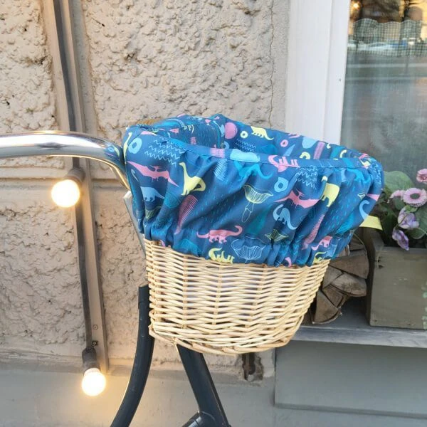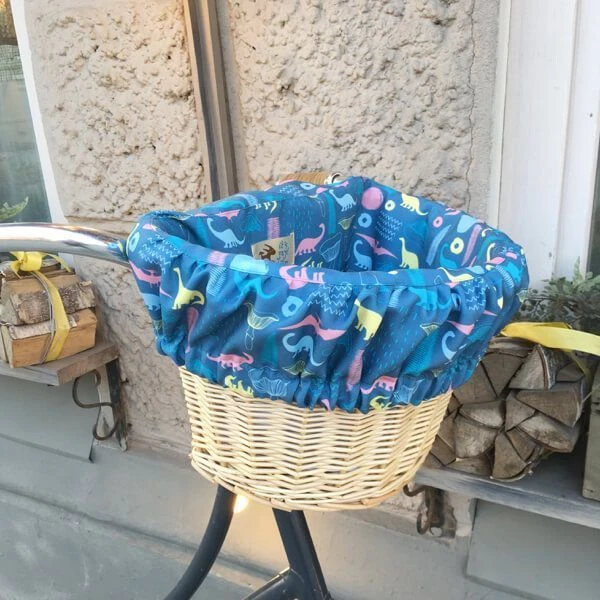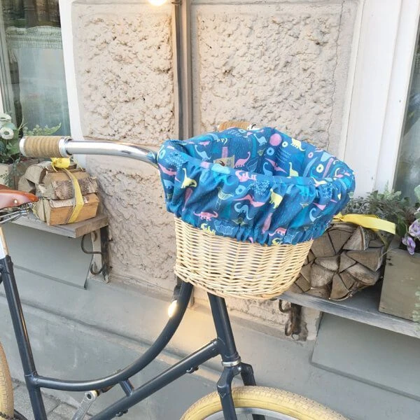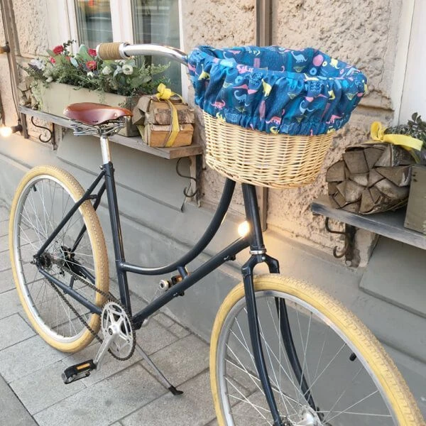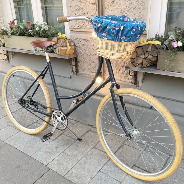 Удобная корзина на руль с ярким вкладышем из ткани.