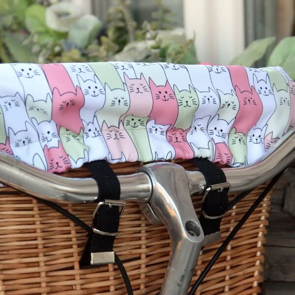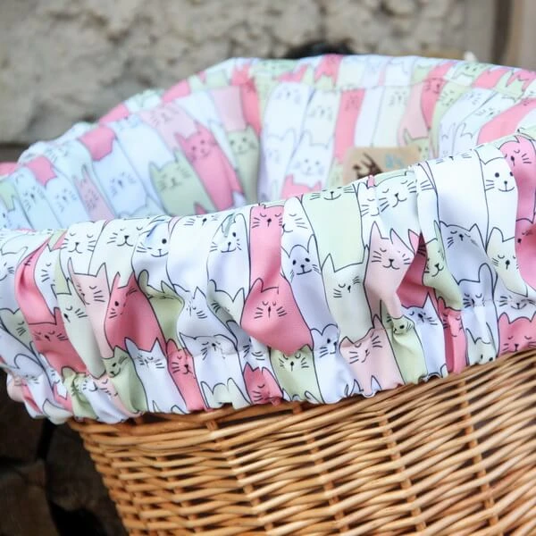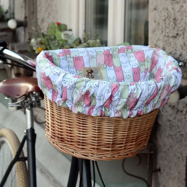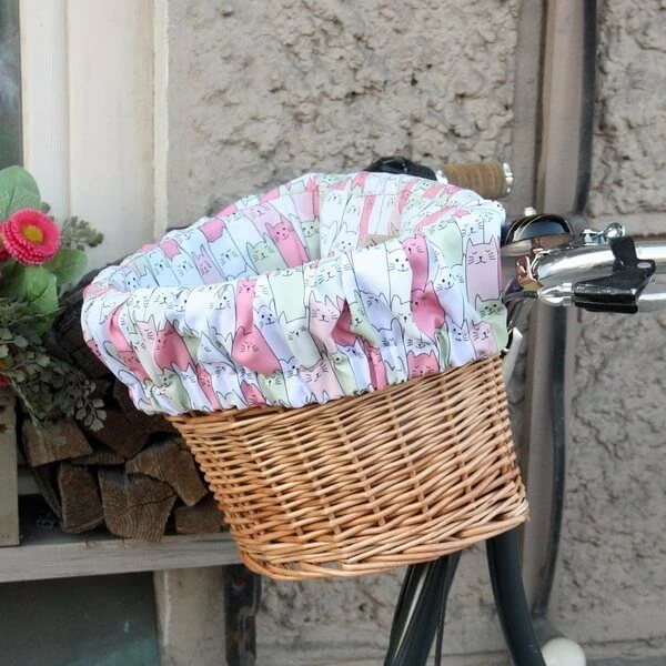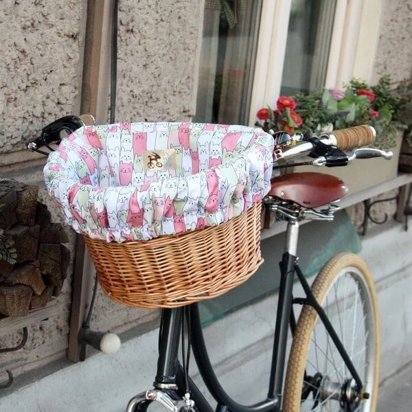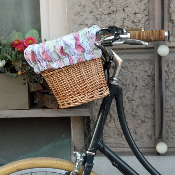 Удобная корзина на руль с ярким вкладышем из ткани.
