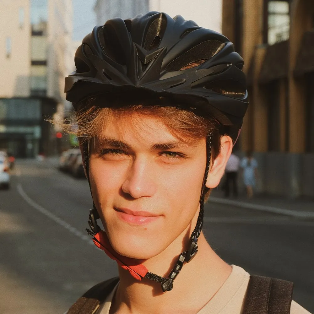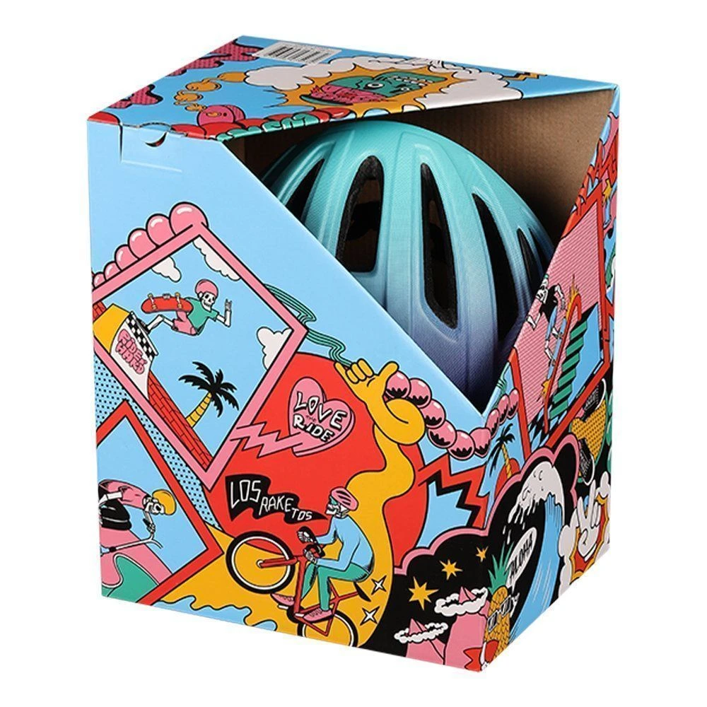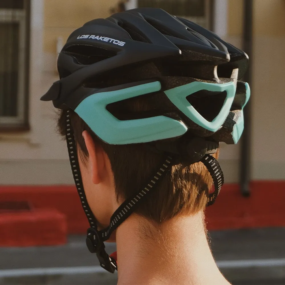 Лёгкий универсальный шлем с голубой вставкой, который отлично подойдёт для летних велосипедных прогулок как для профессионалов, так и для новичков)